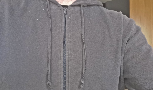 No, no, you don’t know … you can’t know … the fear and loathing that had coursed through the very fabric of my being, not to mention the fabric of my hoodie, the other night when I noticed the drawstring hanging long as the meandering Nile on one side of the hoodie hood, and on the other … the gaping void, the great unfilled eyehole, a vast unexplored cosmos of nothing!